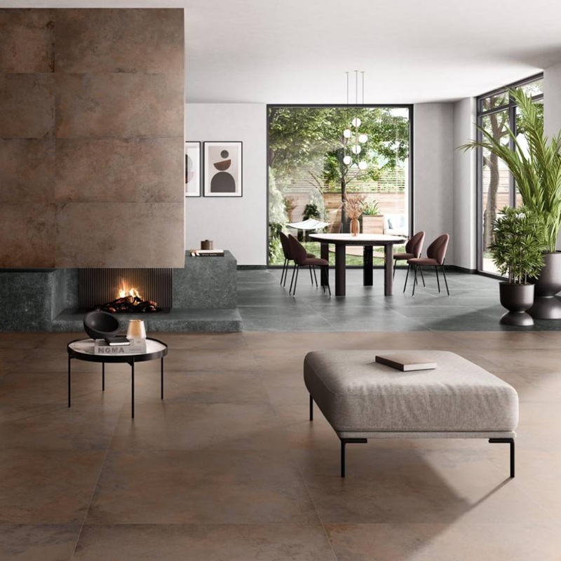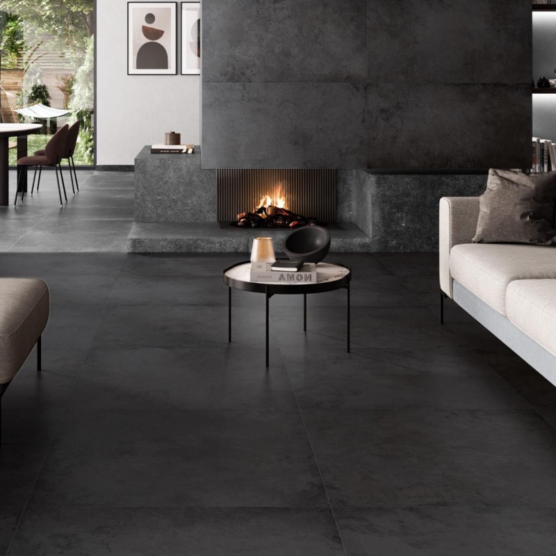 Dans un salon, ce carrelage grand format donne une impression d’espace. Les joints fins renforcent l’effet de continuité et l’élégance visuelle. Associé à un parquet en bois ou à des meubles en métal noir, il sublime la tendance loft. Dans un grand salon au style industriel, ALLOY met en valeur les volumes et donne une identité forte. Associé à des poutres métalliques ou à une décoration en bois, il soulignera l’ambiance loft.
