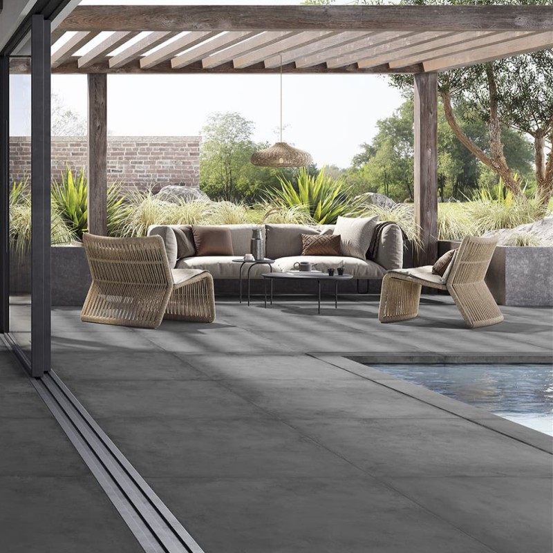 GRAPHITE présente l’avantage d’être disponible en version antidérapante, idéale pour les extérieurs, terrasses ou contours de piscine. Sur une terrasse ou autour d’une piscine, il allie ainsi sécurité et élégance. La finition de surface de ce carreau assure une bonne adhérence, même mouillée, tout en conservant son aspect gris ciment raffiné.