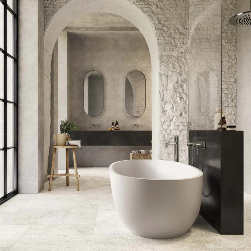 La blancheur douce de MANOR WHITE s’harmonise à merveille avec les teintes plus chaudes du STONES IVORY. Ensemble, ils créent une palette naturelle et lumineuse. Le carrelage style travertin ECHOES, inspiré du vrai travertin, ajoute une note méditerranéenne pleine de texture et de caractère.